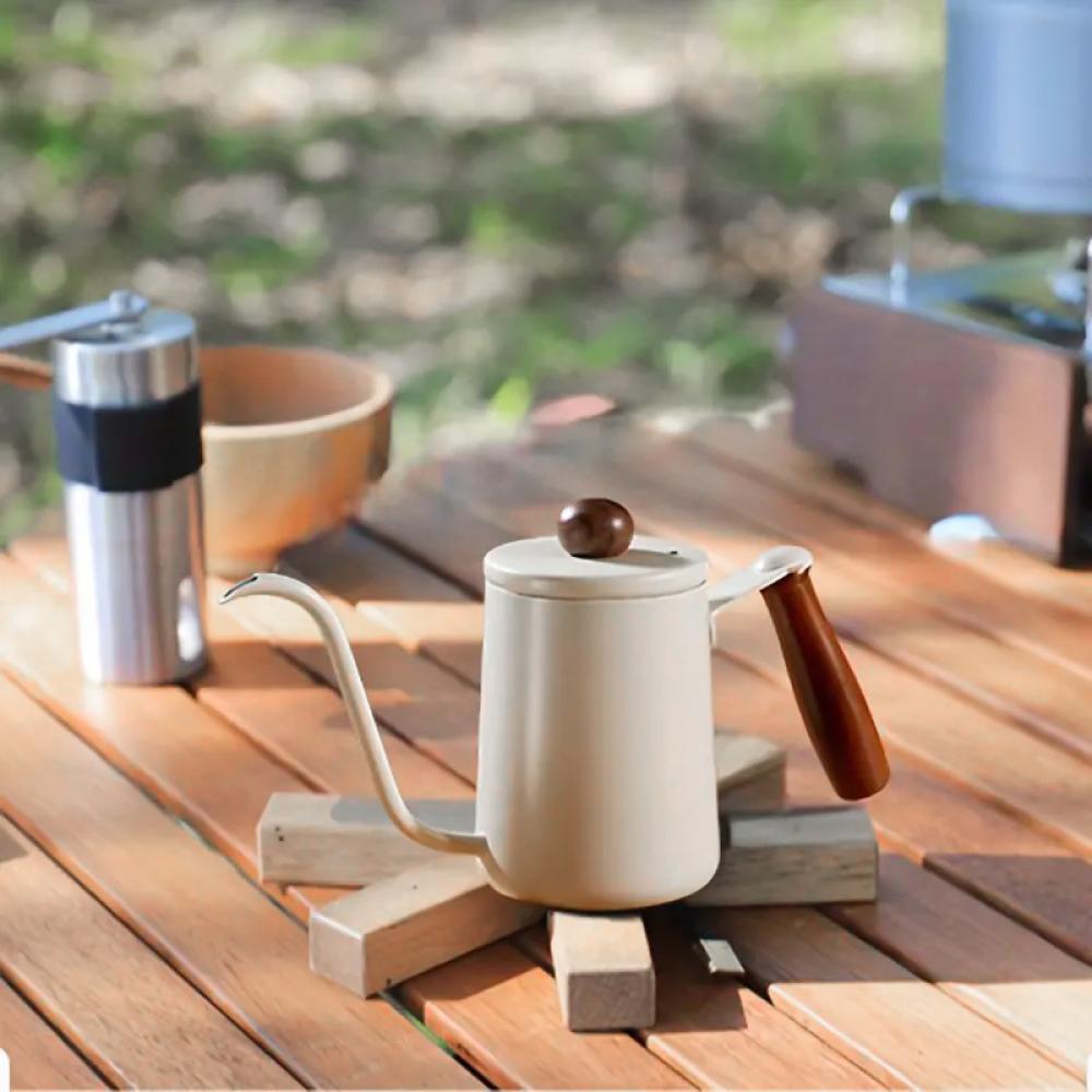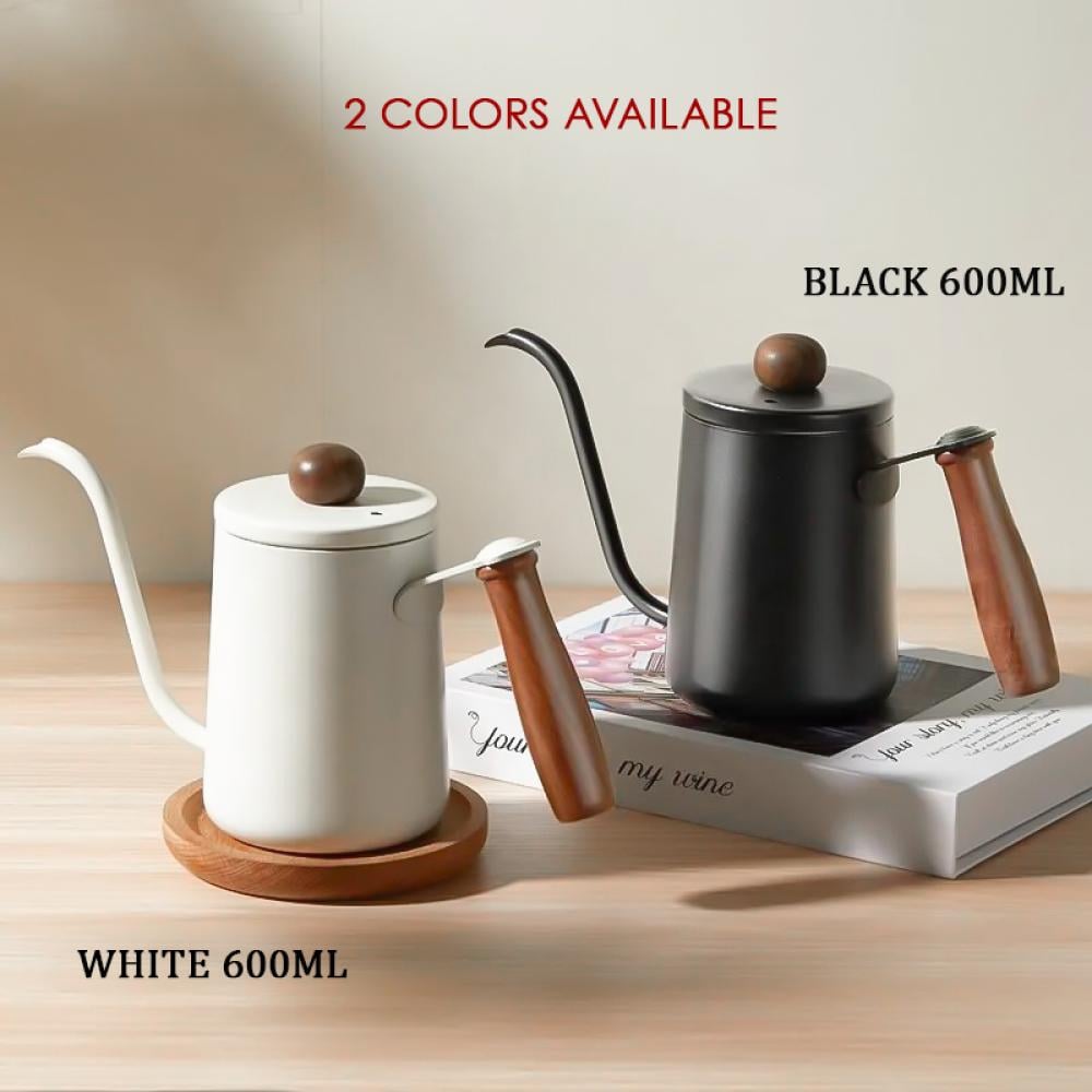Pour Over Coffee Kettle 600ml - Stainless Steel with Wooden Handle & Lid Cap, White Color, Gooseneck Spout, Perfect for V60 Pour Over & Specialty Coffee Brewing